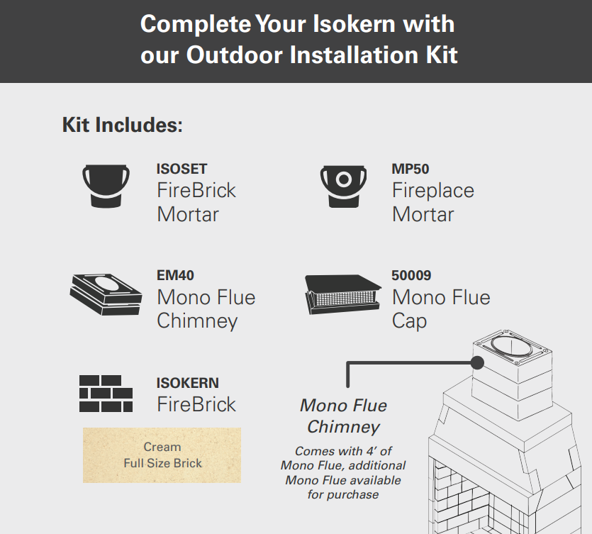 Each outdoor fireplace comes with everything you need. From a mono-flue chimney, to mortar, firebrick and more!